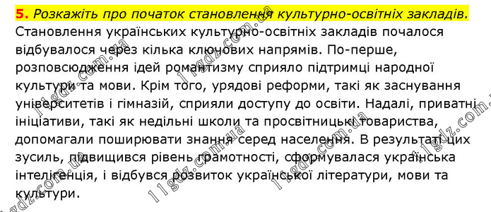 Розкажіть про початок становлення культурно-освітніх закладів. Становлення українських культурно-освітніх закладів почалося відбувалося через кілька ключових напрямів. По-перше, розповсюдження ідей романтизму сприяло підтримці народної культури та мови. Крім того, урядові реформи, такі як заснування університетів і гімназій, сприяли доступу до освіти. Надалі, приватні ініціативи, такі як недільні школи та просвітницькі товариства, допомагали поширювати знання серед населення. В результаті цих зусиль, підвищився рівень грамотності, сформувалася українська інтелігенція, і відбувся розвиток української літератури, мови та культури.
