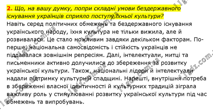 2. Що, на вашу думку, попри складні умови бездержавного існування українців сприяло поступу їхньої культури? Навіть серед політичних обмежень та бездержавного існування українського народу, їхня культура не тільки вижила, але й розвивалася. Це стало можливим завдяки декільком факторам. По-перше, національна самосвідомість і стійкість українців не піддавалася зовнішнім репресіям. Далі, інтелектуали, митці та письменники активно долучилися до збереження та розвитку української культури. Також, національні лідери й інтелектуали надали підтримку культурній спадщині. Нарешті, внутрішня потреба в збереженні власної ідентичності й культурних традицій зіграла важливу роль у стимулюванні розвитку української культури під час обмежень та випробувань.