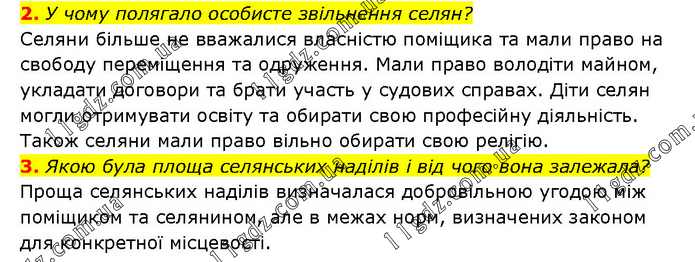 2. У чому полягало особисте звільнення селян? Селяни більше не вважалися власністю поміщика та мали право на свободу переміщення та одруження. Мали право володіти майном, укладати договори та брати участь у судових справах. Діти селян могли отримувати освіту та обирати свою професійну діяльність. Також селяни мали право вільно обирати свою релігію. 3. Якою була площа селянських наділів і від чого вона залежала? Проща селянських наділів визначалася добровільною угодою між поміщиком та селянином, але в межах норм, визначених законом для конкретної місцевості.