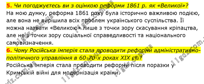 5. Чи погоджуєтесь ви з оцінкою реформи 1861 р. як «Великої»? На мою думку, реформа 1861 року була історично важливою подією, але вона не вирішила всіх проблем українського суспільства. Її можна назвати «Великою» лише з точки зору скасування кріпацтва, але не з точки зору соціальної справедливості та національного самовизначення. 6. Чому Російська імперія стала проводити реформи адміністративно-політичного управління в 60-70-х роках XIX ст.? Російська імперія стала проводити реформи після поразки у Кримській війні для модернізація країни.