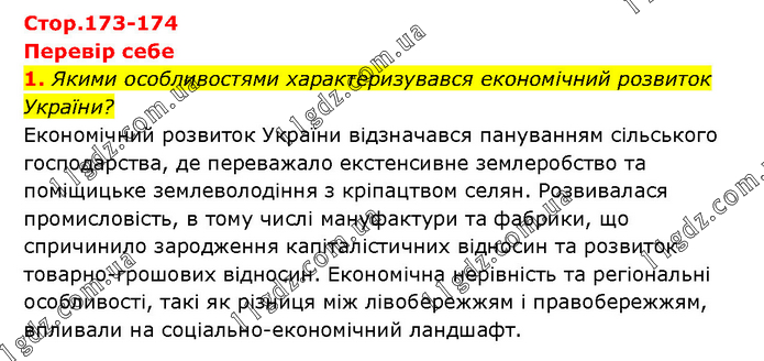 Перевір себе 1. Якими особливостями характеризувався економічний розвиток України? Економічний розвиток України відзначався пануванням сільського господарства, де переважало екстенсивне землеробство та поміщицьке землеволодіння з кріпацтвом селян. Розвивалася промисловість, в тому числі мануфактури та фабрики, що спричинило зародження капіталістичних відносин та розвиток товарно-грошових відносин. Економічна нерівність та регіональні особливості, такі як різниця між лівобережжям і правобережжям, впливали на соціально-економічний ландшафт.