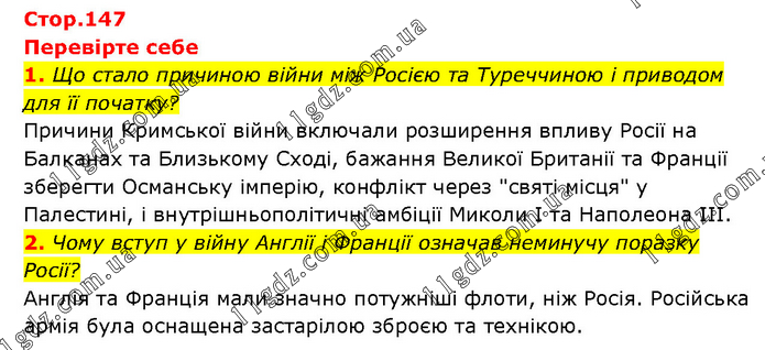Перевірте себе 1. Що стало причиною війни між Росією та Туреччиною і приводом для її початку? Причини Кримської війни включали розширення впливу Росії на Балканах та Близькому Сході, бажання Великої Британії та Франції зберегти Османську імперію, конфлікт через "святі місця" у Палестині, і внутрішньополітичні амбіції Миколи I та Наполеона III. 2. Чому вступ у війну Англії і Франції означав неминучу поразку Росії? Англія та Франція мали значно потужніші флоти, ніж Росія. Російська армія була оснащена застарілою зброєю та технікою.