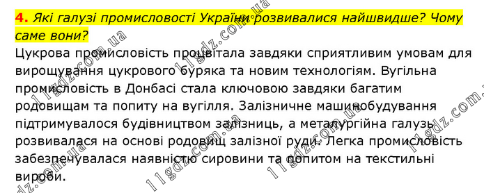 Які галузі промисловості України розвивалися найшвидше? Чому саме вони? Цукрова промисловість процвітала завдяки сприятливим умовам для вирощування цукрового буряка та новим технологіям. Вугільна промисловість в Донбасі стала ключовою завдяки багатим родовищам та попиту на вугілля. Залізничне машинобудування підтримувалося будівництвом залізниць, а металургійна галузь розвивалася на основі родовищ залізної руди. Легка промисловість забезпечувалася наявністю сировини та попитом на текстильні вироби.