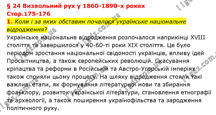 § 24 Визвольний рух у 1860-1890-х роках Стор.175-176 1. Коли і за яких обставин почалося українське національне відродження? Українське національне відродження розпочалося наприкінці XVIII століття та завершилося у 40-60-ті роки XIX століття. Це було періодом зростання національної свідомості українців, впливу ідей Просвітництва, а також європейських революцій. Скасування кріпацтва та реформи в Російській та Австро-Угорській імперіях також сприяли цьому процесу. На шляху відродження стояли такі важливі етапи, як формування літературної мови та збирання фольклору, розвиток української літератури, становлення етнографії та археології, а також поширення українофільства та зародження політичного руху.