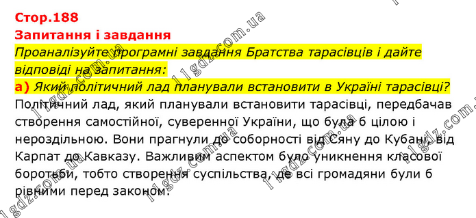 Запитання і завдання Проаналізуйте програмні завдання Братства тарасівців і дайте відповіді на запитання: а) Який політичний лад планували встановити в Україні тарасівці? Політичний лад, який планували встановити тарасівці, передбачав створення самостійної, суверенної України, що була б цілою і нероздільною. Вони прагнули до соборності від Сяну до Кубані, від Карпат до Кавказу. Важливим аспектом було уникнення класової боротьби, тобто створення суспільства, де всі громадяни були б рівними перед законом.