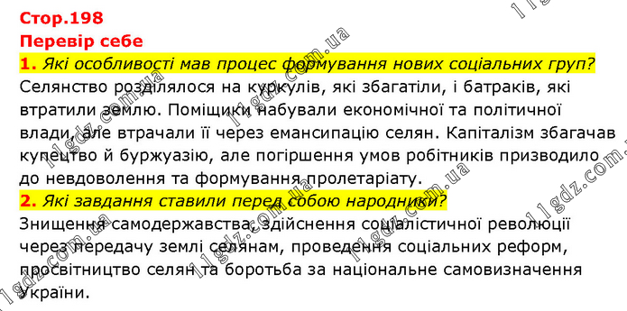 Перевір себе 1. Які особливості мав процес формування нових соціальних груп? Селянство розділялося на куркулів, які збагатіли, і батраків, які втратили землю. Поміщики набували економічної та політичної влади, але втрачали її через емансипацію селян. Капіталізм збагачав купецтво й буржуазію, але погіршення умов робітників призводило до невдоволення та формування пролетаріату. 2. Які завдання ставили перед собою народники? Знищення самодержавства, здійснення соціалістичної революції через передачу землі селянам, проведення соціальних реформ, просвітництво селян та боротьба за національне самовизначення України.