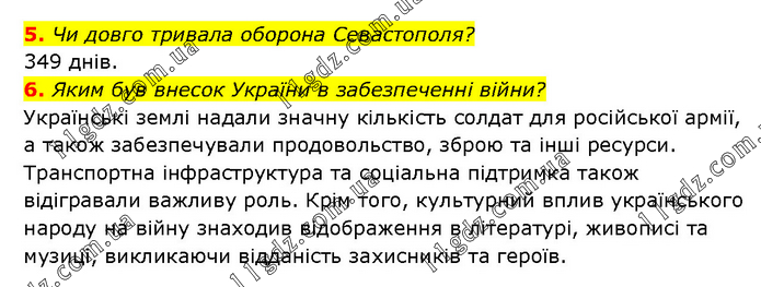 5. Чи довго тривала оборона Севастополя? 349 днів. 6. Яким був внесок України в забезпеченні війни? Українські землі надали значну кількість солдат для російської армії, а також забезпечували продовольство, зброю та інші ресурси. Транспортна інфраструктура та соціальна підтримка також відігравали важливу роль. Крім того, культурний вплив українського народу на війну знаходив відображення в літературі, живописі та музиці, викликаючи відданість захисників та героїв.