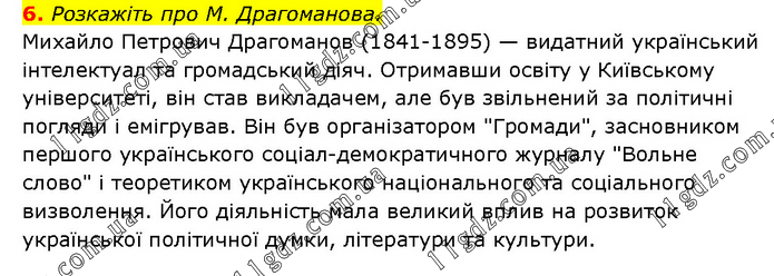 Розкажіть про М. Драгоманова. Михайло Петрович Драгоманов (1841-1895) — видатний український інтелектуал та громадський діяч. Отримавши освіту у Київському університеті, він став викладачем, але був звільнений за політичні погляди і емігрував. Він був організатором "Громади", засновником першого українського соціал-демократичного журналу "Вольне слово" і теоретиком українського національного та соціального визволення. Його діяльність мала великий вплив на розвиток української політичної думки, літератури та культури.