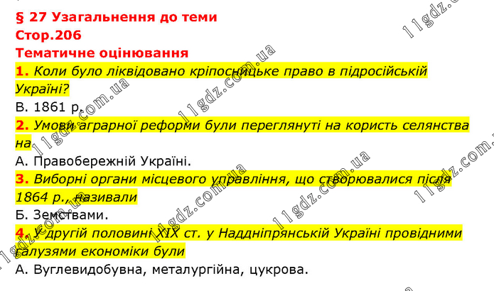 § 27 Узагальнення до теми Стор.206 Тематичне оцінювання 1. Коли було ліквідовано кріпосницьке право в підросійській Україні? В. 1861 р. 2. Умови аграрної реформи були переглянуті на користь селянства на А. Правобережній Україні. 3. Виборні органи місцевого управління, що створювалися після 1864 р., називали Б. Земствами. 4. У другій половині ХІХ ст. у Наддніпрянській Україні провідними галузями економіки були А. Вуглевидобувна, металургійна, цукрова.