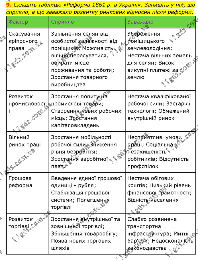 Складіть таблицю «Реформа 1861 р. в Україні». Запишіть у ній, що сприяло, а що заважало розвитку ринкових відносин після реформи.
