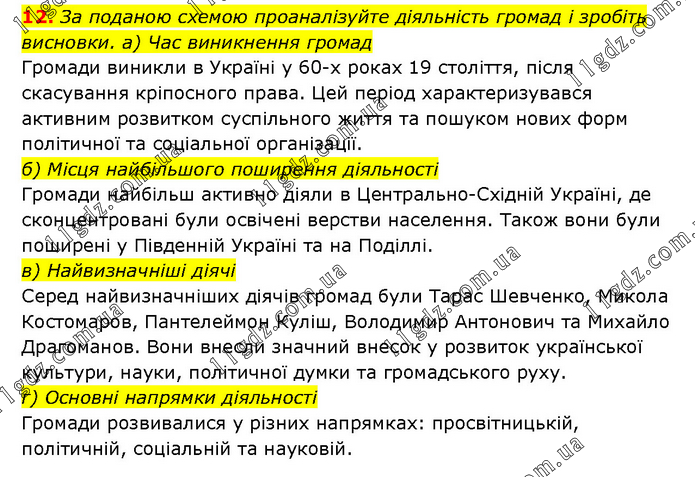 За поданою схемою проаналізуйте діяльність громад і зробіть висновки. а) Час виникнення громад Громади виникли в Україні у 60-х роках 19 століття, після скасування кріпосного права. Цей період характеризувався активним розвитком суспільного життя та пошуком нових форм політичної та соціальної організації. б) Місця найбільшого поширення діяльності Громади найбільш активно діяли в Центрально-Східній Україні, де сконцентровані були освічені верстви населення. Також вони були поширені у Південній Україні та на Поділлі. в) Найвизначніші діячі Серед найвизначніших діячів громад були Тарас Шевченко, Микола Костомаров, Пантелеймон Куліш, Володимир Антонович та Михайло Драгоманов. Вони внесли значний внесок у розвиток української культури, науки, політичної думки та громадського руху. г) Основні напрямки діяльності Громади розвивалися у різних напрямках: просвітницькій, політичній, соціальній та науковій.