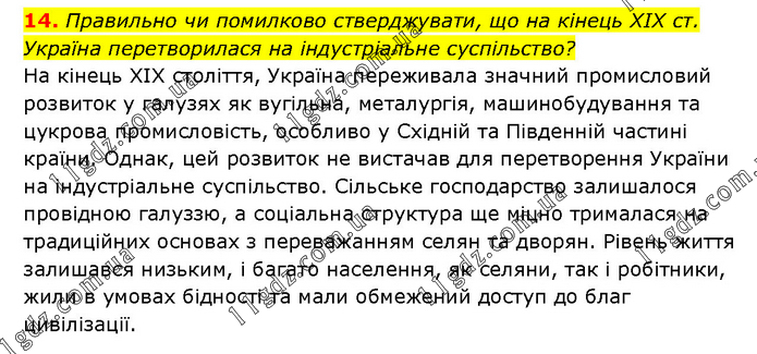 Правильно чи помилково стверджувати, що на кінець ХІХ ст. Україна перетворилася на індустріальне суспільство? На кінець XIX століття, Україна переживала значний промисловий розвиток у галузях як вугільна, металургія, машинобудування та цукрова промисловість, особливо у Східній та Південній частині країни. Однак, цей розвиток не вистачав для перетворення України на індустріальне суспільство. Сільське господарство залишалося провідною галуззю, а соціальна структура ще міцно трималася на традиційних основах з переважанням селян та дворян. Рівень життя залишався низьким, і багато населення, як селяни, так і робітники, жили в умовах бідності та мали обмежений доступ до благ цивілізації.
