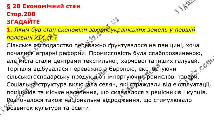 § 28 Економічний стан Стор.208 ЗГАДАЙТЕ 1. Яким був стан економіки західноукраїнських земель у першій половині XIX ст.? Сільське господарство переважно ґрунтувалося на панщині, хоча почалися аграрні реформи. Промисловість була слаборозвиненою, але міста стали центрами текстильної, харчової та інших галузей. Торгівля відбувалася переважно з Європою, експортуючи сільськогосподарську продукцію і імпортуючи промислові товари. Соціальна структура включала селян, які страждали від експлуатації, поміщиків та міське населення, що складалося з ремісників і купців. Розпочалося також національне відродження, що стимулювало розвиток культури та освіти.
