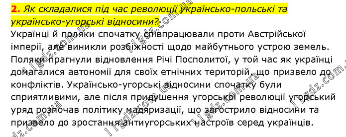 Як складалися під час революції українсько-польські та українсько-угорські відносини? Українці й поляки спочатку співпрацювали проти Австрійської імперії, але виникли розбіжності щодо майбутнього устрою земель. Поляки прагнули відновлення Річі Посполитої, у той час як українці домагалися автономії для своїх етнічних територій, що призвело до конфліктів. Українсько-угорські відносини спочатку були сприятливими, але після придушення угорської революції угорський уряд розпочав політику мадяризації, що загострило відносини та призвело до зростання антиугорських настроїв серед українців.