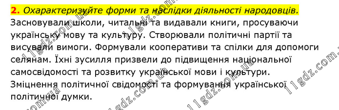 Охарактеризуйте форми та наслідки діяльності народовців. Засновували школи, читальні та видавали книги, просуваючи українську мову та культуру. Створювали політичні партії та висували вимоги. Формували кооперативи та спілки для допомоги селянам. Їхні зусилля призвели до підвищення національної самосвідомості та розвитку української мови і культури. Зміцнення політичної свідомості та формування української політичної думки.