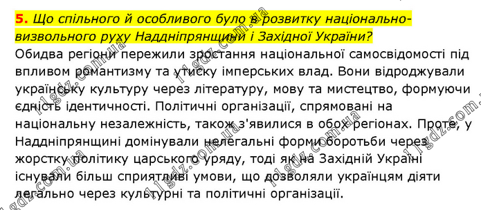 Що спільного й особливого було в розвитку національно-визвольного руху Наддніпрянщини і Західної України? Обидва регіони пережили зростання національної самосвідомості під впливом романтизму та утиску імперських влад. Вони відроджували українську культуру через літературу, мову та мистецтво, формуючи єдність ідентичності. Політичні організації, спрямовані на національну незалежність, також з'явилися в обох регіонах. Проте, у Наддніпрянщині домінували нелегальні форми боротьби через жорстку політику царського уряду, тоді як на Західній Україні існували більш сприятливі умови, що дозволяли українцям діяти легально через культурні та політичні організації.