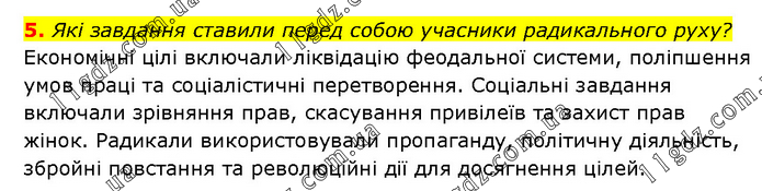Які завдання ставили перед собою учасники радикального руху? Економічні цілі включали ліквідацію феодальної системи, поліпшення умов праці та соціалістичні перетворення. Соціальні завдання включали зрівняння прав, скасування привілеїв та захист прав жінок. Радикали використовували пропаганду, політичну діяльність, збройні повстання та революційні дії для досягнення цілей.