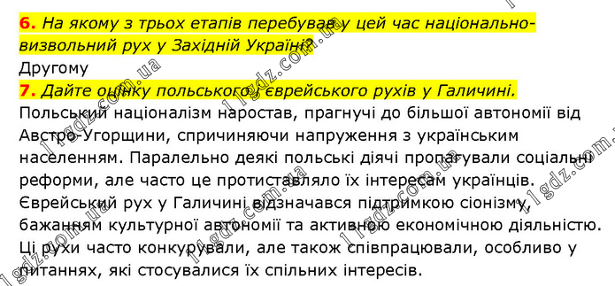 6. На якому з трьох етапів перебував у цей час національно- визвольний рух у Західній Україні? Другому 7. Дайте оцінку польського і єврейського рухів у Галичині. Польський націоналізм наростав, прагнучі до більшої автономії від Австро-Угорщини, спричиняючи напруження з українським населенням. Паралельно деякі польські діячі пропагували соціальні реформи, але часто це протиставляло їх інтересам українців. Єврейський рух у Галичині відзначався підтримкою сіонізму, бажанням культурної автономії та активною економічною діяльністю. Ці рухи часто конкурували, але також співпрацювали, особливо у питаннях, які стосувалися їх спільних інтересів.
