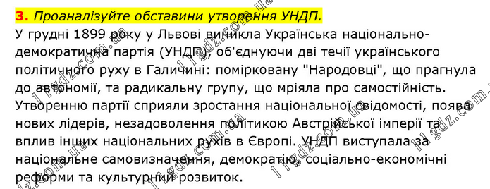 Проаналізуйте обставини утворення УНДП. У грудні 1899 року у Львові виникла Українська національно-демократична партія (УНДП), об'єднуючи дві течії українського політичного руху в Галичині: помірковану "Народовці", що прагнула до автономії, та радикальну групу, що мріяла про самостійність. Утворенню партії сприяли зростання національної свідомості, поява нових лідерів, незадоволення політикою Австрійської імперії та вплив інших національних рухів в Європі. УНДП виступала за національне самовизначення, демократію, соціально-економічні реформи та культурний розвиток.