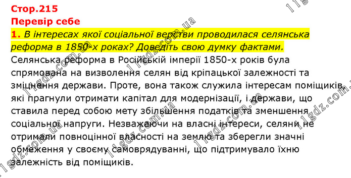 Перевір себе 1. В інтересах якої соціальної верстви проводилася селянська реформа в 1850-х роках? Доведіть свою думку фактами. Селянська реформа в Російській імперії 1850-х років була спрямована на визволення селян від кріпацької залежності та зміцнення держави. Проте, вона також служила інтересам поміщиків, які прагнули отримати капітал для модернізації, і держави, що ставила перед собою мету збільшення податків та зменшення соціальної напруги. Незважаючи на власні інтереси, селяни не отримали повноцінної власності на землю та зберегли значні обмеження у своєму самоврядуванні, що підтримувало їхню залежність від поміщиків.