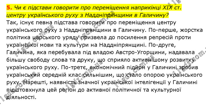Чи є підстави говорити про переміщення наприкінці XIX ст. центру українського руху з Наддніпрянщини в Галичину? Так, існує певна підстава говорити про переміщення центру українського руху з Наддніпрянщини в Галичину. По-перше, жорстка політика царського уряду призвела до посилення репресій проти української мови та культури на Наддніпрянщині. По-друге, Галичина, яка перебувала під владою Австро-Угорщини, надавала більшу свободу слова та друку, що сприяло активнішому розвитку українського руху. По-третє, економічний підйом у Галичині зробив український середній клас сильнішим, що стало опорою українського руху. Нарешті, наявність значної української інтелігенції у Галичині підштовхнула цей регіон до активної політичної та культурної діяльності.