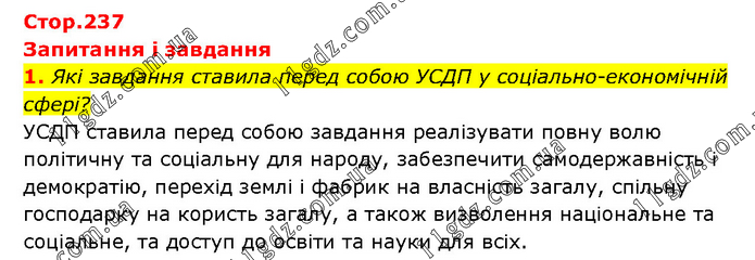 Запитання і завдання 1. Які завдання ставила перед собою УСДП у соціально-економічній сфері? УСДП ставила перед собою завдання реалізувати повну волю політичну та соціальну для народу, забезпечити самодержавність і демократію, перехід землі і фабрик на власність загалу, спільну господарку на користь загалу, а також визволення національне та соціальне, та доступ до освіти та науки для всіх.