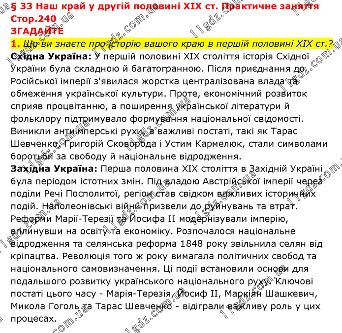 § 33 Наш край у другій половині ХІХ ст. Практичне заняття Стор.240 ЗГАДАЙТЕ 1. Що ви знаєте про історію вашого краю в першій половині ХІХ ст.? Східна Україна: У першій половині XIX століття історія Східної України була складною й багатогранною. Після приєднання до Російської імперії з'явилася жорстка централізована влада та обмеження української культури. Проте, економічний розвиток сприяв процвітанню, а поширення української літератури й фольклору підтримувало формування національної свідомості. Виникли антиімперські рухи, а важливі постаті, такі як Тарас Шевченко, Григорій Сковорода і Устим Кармелюк, стали символами боротьби за свободу й національне відродження. Західна Україна: Перша половина XIX століття в Західній Україні була періодом істотних змін. Під владою Австрійської імперії через поділи Речі Посполитої, регіон став свідком важливих історичних подій. Наполеонівські війни призвели до руйнувань та втрат. Реформи Марії-Терезії та Йосифа II модернізували імперію, вплинувши на освіту та економіку. Розпочалося національне відродження та селянська реформа 1848 року звільнила селян від кріпацтва. Революція того ж року вимагала політичних свобод та національного самовизначення. Ці події встановили основи для подальшого розвитку українського національного руху. Ключові постаті цього часу - Марія-Терезія, Йосиф II, Маркіян Шашкевич, Микола Гоголь та Тарас Шевченко - відіграли важливу роль у цих процесах.