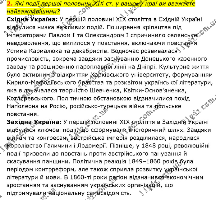 Які події першої половини ХІХ ст. у вашому краї ви вважаєте найважливішими? Східна Україна: У першій половині XIX століття в Східній Україні відбулися низка важливих подій. Поширення кріпацтва під імператорами Павлом І та Олександром І спричинило селянське невдоволення, що вилилося у повстання, включаючи повстання Устима Кармалюка та декабристів. Водночас розвивалася промисловість, зокрема завдяки заснуванню Донецького казенного заводу та розширенню пароплавної лінії на Дніпрі. Культурне життя було активним з відкриттям Харківського університету, формуванням Кирило-Мефодіївського братства та розквітом української літератури, яка відзначалася творчістю Шевченка, Квітки-Основ'яненка, Котляревського. Політичною обстановкою відзначилися похід Наполеона на Росію, російсько-турецька війна та польське повстання. Західна Україна: У першій половині XIX століття в Західній Україні відбулися ключові події, що сформували її історичний шлях. Завдяки війнам та конгресам, австрійська імперія розділилася, народився Королівство Галичини і Лодомерії. Пізніше, у 1848 році, революційні події призвели до повстань проти австрійського панування й скасування панщини. Політична реакція 1849–1860 років була періодом контрреформ, але також сприяла розвитку української літератури й мови. В 1860-ті роки регіон відзначився економічним зростанням та заснуванням українських організацій, що підтримували національну самосвідомість.