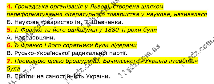 4. Громадська організація у Львові, створена шляхом переформатування літературного товариства у наукове, називалася Б. Наукове товариство ім. Т. Шевченка. 5. І. Франко та його однодумці у 1880-ті роки були А. Народовцями. 6. І. Франко і його соратники були лідерами В. Русько-Української радикальної партії. 7. Провідною ідеєю брошури Ю. Бачинського «Україна irredenta» була В. Політична самостійність України.
