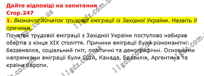 Дайте відповіді на запитання Стор.247 1. Визначте початок трудової еміграції із Західної України. Назвіть її причини. Початок трудової еміграції з Західної України поступово набирав обертів з кінця XIX століття. Причини еміграції були різноманітні: безземелля, соціальний гніт, політичні та демографічні. Основними напрямками еміграції були США, Канада, Бразилія, Аргентина та країни Європи.