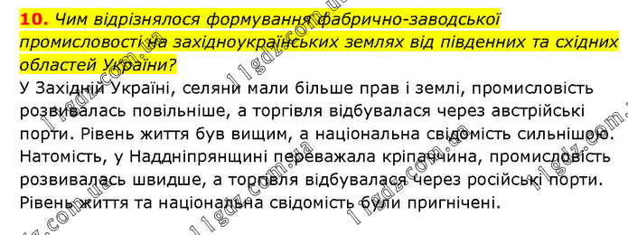 Чим відрізнялося формування фабрично-заводської промисловості на західноукраїнських землях від південних та східних областей України? У Західній Україні, селяни мали більше прав і землі, промисловість розвивалась повільніше, а торгівля відбувалася через австрійські порти. Рівень життя був вищим, а національна свідомість сильнішою. Натомість, у Наддніпрянщині переважала кріпаччина, промисловість розвивалась швидше, а торгівля відбувалася через російські порти. Рівень життя та національна свідомість були пригнічені.