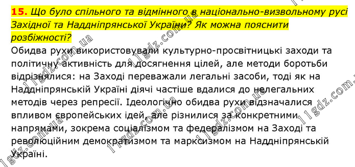 Що було спільного та відмінного в національно-визвольному русі Західної та Наддніпрянської України? Як можна пояснити розбіжності? Обидва рухи використовували культурно-просвітницькі заходи та політичну активність для досягнення цілей, але методи боротьби відрізнялися: на Заході переважали легальні засоби, тоді як на Наддніпрянській Україні діячі частіше вдалися до нелегальних методів через репресії. Ідеологічно обидва рухи відзначалися впливом європейських ідей, але різнилися за конкретними напрямами, зокрема соціалізмом та федералізмом на Заході та революційним демократизмом та марксизмом на Наддніпрянській Україні.