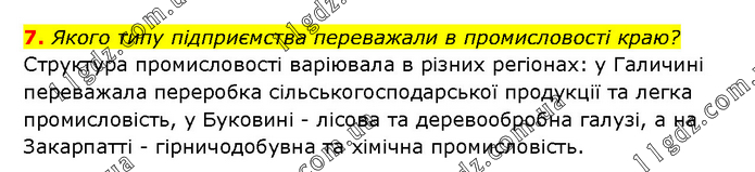 Якого типу підприємства переважали в промисловості краю? Структура промисловості варіювала в різних регіонах: у Галичині переважала переробка сільськогосподарської продукції та легка промисловість, у Буковині - лісова та деревообробна галузі, а на Закарпатті - гірничодобувна та хімічна промисловість.