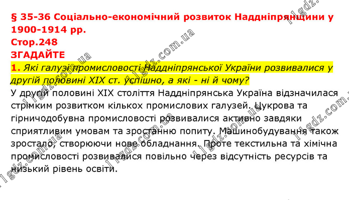 § 35-36 Соціально-економічний розвиток Наддніпрянщини у 1900-1914 рр. Стор.248 ЗГАДАЙТЕ 1. Які галузі промисловості Наддніпрянської України розвивалися у другій половині ХІХ ст. успішно, а які - ні й чому? У другій половині ХІХ століття Наддніпрянська Україна відзначилася стрімким розвитком кількох промислових галузей. Цукрова та гірничодобувна промисловості розвивалися активно завдяки сприятливим умовам та зростанню попиту. Машинобудування також зростало, створюючи нове обладнання. Проте текстильна та хімічна промисловості розвивалися повільно через відсутність ресурсів та низький рівень освіти.