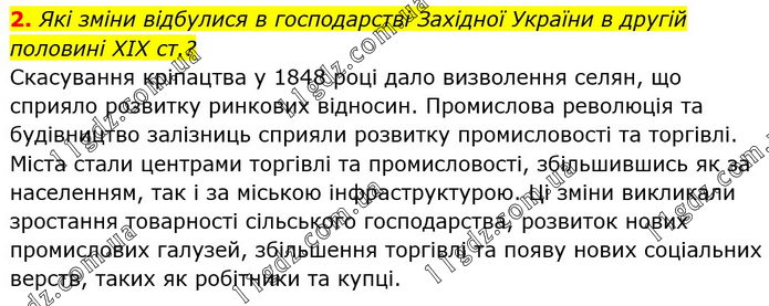 Які зміни відбулися в господарстві Західної України в другій половині ХІХ ст.? Скасування кріпацтва у 1848 році дало визволення селян, що сприяло розвитку ринкових відносин. Промислова революція та будівництво залізниць сприяли розвитку промисловості та торгівлі. Міста стали центрами торгівлі та промисловості, збільшившись як за населенням, так і за міською інфраструктурою. Ці зміни викликали зростання товарності сільського господарства, розвиток нових промислових галузей, збільшення торгівлі та появу нових соціальних верств, таких як робітники та купці.