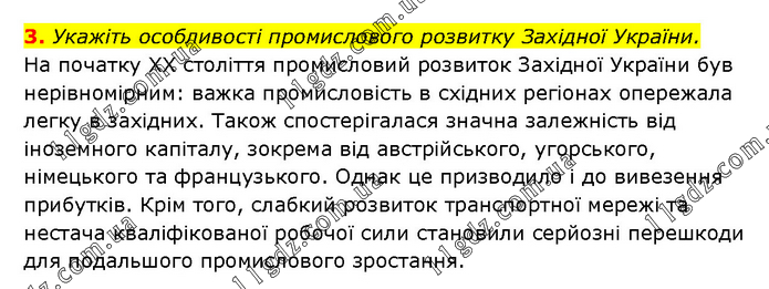 Укажіть особливості промислового розвитку Західної України. На початку ХХ століття промисловий розвиток Західної України був нерівномірним: важка промисловість в східних регіонах опережала легку в західних. Також спостерігалася значна залежність від іноземного капіталу, зокрема від австрійського, угорського, німецького та французького. Однак це призводило і до вивезення прибутків. Крім того, слабкий розвиток транспортної мережі та нестача кваліфікованої робочої сили становили серйозні перешкоди для подальшого промислового зростання.