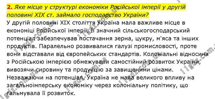 Яке місце у структурі економіки Російської імперії у другій половині ХІХ ст. займало господарство України? У другій половині XIX століття Україна мала важливе місце в економіці Російської імперії. Її значний сільськогосподарський потенціал забезпечував постачання зерна, цукру, м'яса та інших продуктів. Паралельно розвивалися галузі промисловості, проте вони відставали від європейських стандартів. Колоніальні відносини з Російською імперією обмежували самостійний розвиток України, вивозячи сировину та продукцію за завищеними цінами. Незважаючи на потенціал, Україна не мала великого впливу на загальноімперську економіку через колоніальну політику, що гальмувала її розвиток.
