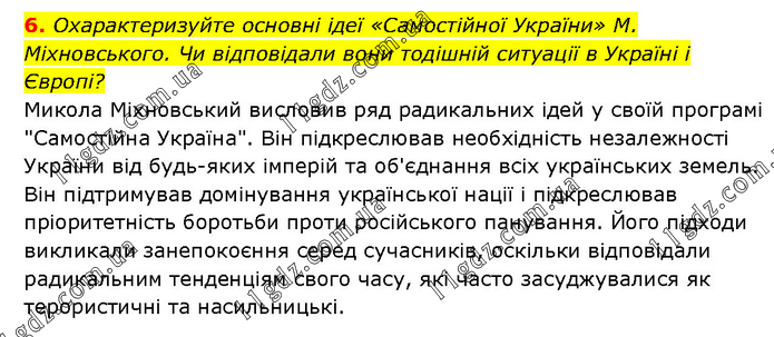 Охарактеризуйте основні ідеї «Самостійної України» М. Міхновського. Чи відповідали вони тодішній ситуації в Україні і Європі? Микола Міхновський висловив ряд радикальних ідей у своїй програмі "Самостійна Україна". Він підкреслював необхідність незалежності України від будь-яких імперій та об'єднання всіх українських земель. Він підтримував домінування української нації і підкреслював пріоритетність боротьби проти російського панування. Його підходи викликали занепокоєння серед сучасників, оскільки відповідали радикальним тенденціям свого часу, які часто засуджувалися як терористичні та насильницькі.