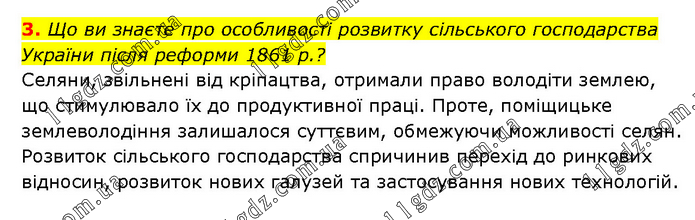 Що ви знаєте про особливості розвитку сільського господарства України після реформи 1861 р.? Селяни, звільнені від кріпацтва, отримали право володіти землею, що стимулювало їх до продуктивної праці. Проте, поміщицьке землеволодіння залишалося суттєвим, обмежуючи можливості селян. Розвиток сільського господарства спричинив перехід до ринкових відносин, розвиток нових галузей та застосування нових технологій.