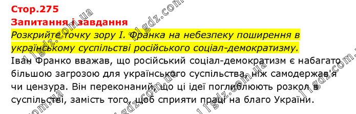 Запитання і завдання Розкрийте точку зору І. Франка на небезпеку поширення в українському суспільстві російського соціал-демократизму. Іван Франко вважав, що російський соціал-демократизм є набагато більшою загрозою для українського суспільства, ніж самодержав'я чи цензура. Він переконаний, що ці ідеї поглиблюють розкол в суспільстві, замість того, щоб сприяти праці на благо України.