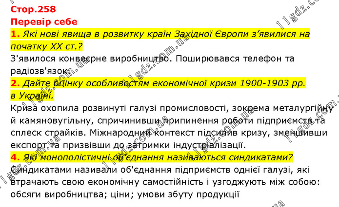 Перевір себе 1. Які нові явища в розвитку країн Західної Європи з’явилися на початку XX ст.? З'явилося конвеєрне виробництво. Поширювався телефон та радіозв'язок. 2. Дайте оцінку особливостям економічної кризи 1900-1903 рр. в Україні. Криза охопила розвинуті галузі промисловості, зокрема металургійну й камяновугільну, спричинивши припинення роботи підприємств та сплеск страйків. Міжнародний контекст підсилив кризу, зменшивши експорт та призвівши до затримки індустріалізації. 4. Які монополістичні об’єднання називаються синдикатами? Синдикатами називали об'єднання підприємств однієї галузі, які втрачають свою економічну самостійність і узгоджують між собою: обсяги виробництва; ціни; умови збуту продукції
