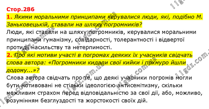 1. Якими моральними принципами керувалися люди, які, подібно М. Заньковецькій, ставали на шляху погромників? Люди, які ставали на шляху погромників, керувалися моральними принципами гуманізму, солідарності, толерантності і відвертої протидії насильству та нетерпимості. 2. Про які мотиви участі в погромах деяких їх учасників свідчать слова автора: «Погромники кидали свої кийки і похмуро йшли додому...»? Слова автора свідчать про те, що деякі учасники погромів могли бути мотивовані не стільки ідеологією антисемітизму, скільки можливим страхом перед відповідальністю за свої дії, або, можливо, розумінням безглуздості та жорстокості своїх дій.