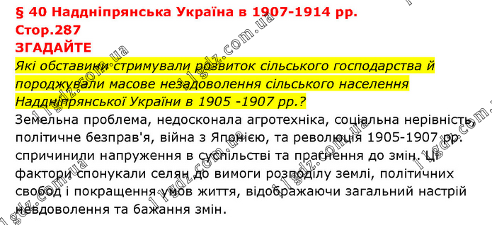 § 40 Наддніпрянська Україна в 1907-1914 рр. Стор.287 ЗГАДАЙТЕ Які обставини стримували розвиток сільського господарства й породжували масове незадоволення сільського населення Наддніпрянської України в 1905 -1907 рр.? Земельна проблема, недосконала агротехніка, соціальна нерівність, політичне безправ'я, війна з Японією, та революція 1905-1907 рр. спричинили напруження в суспільстві та прагнення до змін. Ці фактори спонукали селян до вимоги розподілу землі, політичних свобод і покращення умов життя, відображаючи загальний настрій невдоволення та бажання змін.