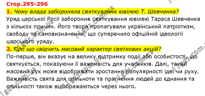 1. Чому влада забороняла святкування ювілею Т. Шевченка? Уряд царської Росії заборонив святкування ювілею Тараса Шевченка з кількох причин. Його твори пропагували український патріотизм, свободу та самовизначення, що суперечило офіційній ідеології царського уряду. 2. Про що свідчить масовий характер святкових акцій? По-перше, він вказує на велику підтримку події або особистості, що святкується, показуючи її важливість для учасників. Далі, такий масовий рух може відображати зростання популярності ідеї чи руху. Важливість свята для спільноти та прагнення людей до єднання та спільності також відображаються через нього.