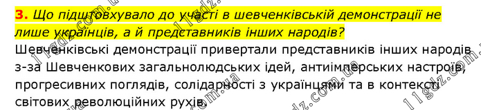 Що підштовхувало до участі в шевченківській демонстрації не лише українців, а й представників інших народів? Шевченківські демонстрації привертали представників інших народів з-за Шевченкових загальнолюдських ідей, антиімперських настроїв, прогресивних поглядів, солідарності з українцями та в контексті світових революційних рухів.