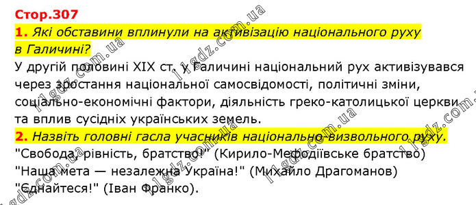 1. Які обставини вплинули на активізацію національного руху в Галичині? У другій половині ХІХ ст. у Галичині національний рух активізувався через зростання національної самосвідомості, політичні зміни, соціально-економічні фактори, діяльність греко-католицької церкви та вплив сусідніх українських земель. 2. Назвіть головні гасла учасників національно-визвольного руху. "Свобода, рівність, братство!" (Кирило-Мефодіївське братство) "Наша мета — незалежна Україна!" (Михайло Драгоманов) "Єднайтеся!" (Іван Франко).