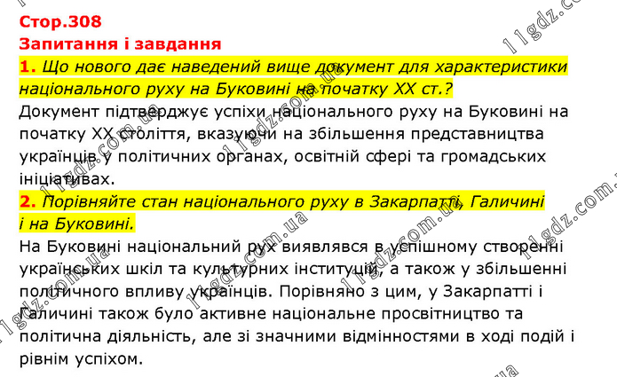 Запитання і завдання 1. Що нового дає наведений вище документ для характеристики національного руху на Буковині на початку ХХ ст.? Документ підтверджує успіхи національного руху на Буковині на початку ХХ століття, вказуючи на збільшення представництва українців у політичних органах, освітній сфері та громадських ініціативах. 2. Порівняйте стан національного руху в Закарпатті, Галичині і на Буковині. На Буковині національний рух виявлявся в успішному створенні українських шкіл та культурних інституцій, а також у збільшенні політичного впливу українців. Порівняно з цим, у Закарпатті і Галичині також було активне національне просвітництво та політична діяльність, але зі значними відмінностями в ході подій і рівнім успіхом.