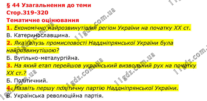 § 44 Узагальнення до теми Стор.319-320 Тематичне оцінювання 1. Економічно найрозвинутіший регіон України на початку ХХ ст. В. Катеринославщина. 2. Яка галузь промисловості Наддніпрянської України була найрозвинутішою? Б. Вугільно-металургійна. 3. На який етап перейшов український визвольний рух на початку ХХ ст.? Б. Політичний. 4. Назвіть першу політичну партію Наддніпрянської України. В. Українська революційна партія.