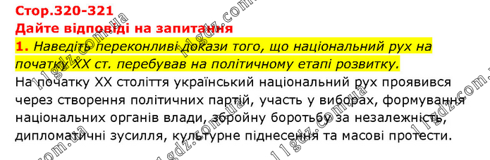 Дайте відповіді на запитання 1. Наведіть переконливі докази того, що національний рух на початку ХХ ст. перебував на політичному етапі розвитку. На початку ХХ століття український національний рух проявився через створення політичних партій, участь у виборах, формування національних органів влади, збройну боротьбу за незалежність, дипломатичні зусилля, культурне піднесення та масові протести.