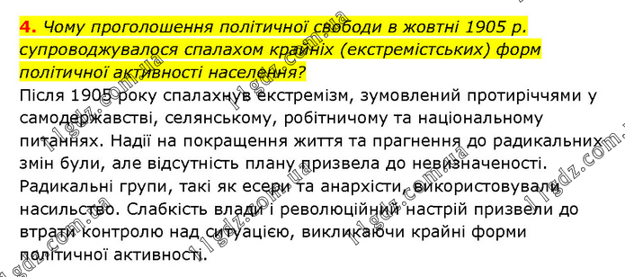 Чому проголошення політичної свободи в жовтні 1905 р. супроводжувалося спалахом крайніх (екстремістських) форм політичної активності населення? Після 1905 року спалахнув екстремізм, зумовлений протиріччями у самодержавстві, селянському, робітничому та національному питаннях. Надії на покращення життя та прагнення до радикальних змін були, але відсутність плану призвела до невизначеності. Радикальні групи, такі як есери та анархісти, використовували насильство. Слабкість влади і революційний настрій призвели до втрати контролю над ситуацією, викликаючи крайні форми політичної активності.